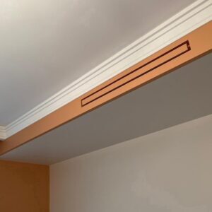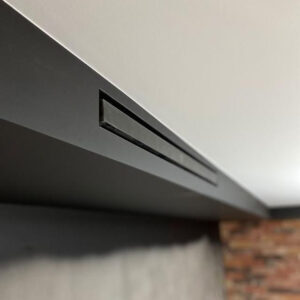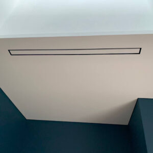 Invisible paintable air grille with built-in fan. Metal lattice is 0.7 mm. High-quality powder coating. For the walls and ceilings. No visible frame around the gap perimeter. The central part is made from metal. Painted to match the color of the walls or ceiling.