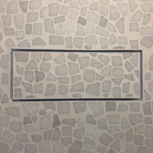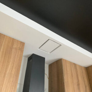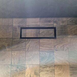 Invisible air grille with built-in fan. Metal lattice is 1 mm. High-quality powder coating. For the walls and ceilings. No visible frame around the gap perimeter. A decorative element can be inserted into the central part and made from any finishing coating: tile, parquet, stone, etc.